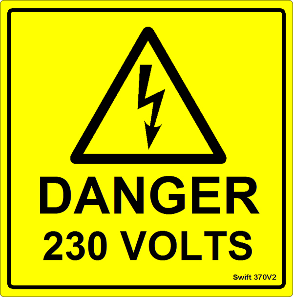 The label clearly states ‘Danger 230 volts’ on a yellow background.